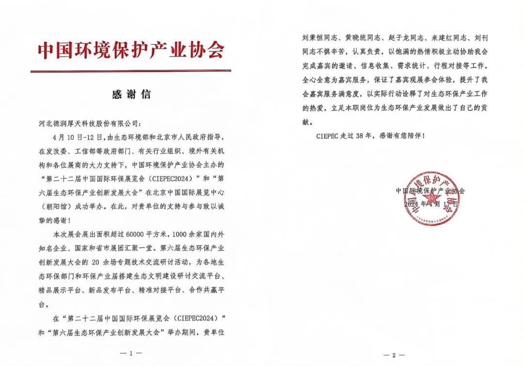 近日,中国环境保护产业协会(中环协)向红宝石网址线路检测中心发来感谢信,对德润厚天及其员工在第二十二届中国国际环保展览会(CIEPEC2024)期间积极贡献和展现的专业素养表示高度赞赏和衷心感谢。