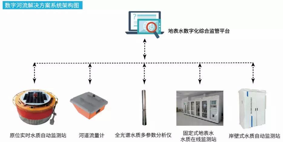 数字河流解决方案由地表水数字化综合监管平台、原位实时水质自动监测站、河道流量计、全光谱水质多参数分析仪、固定式地表水水质在线监测站、岸壁式水质自动监测站构成。