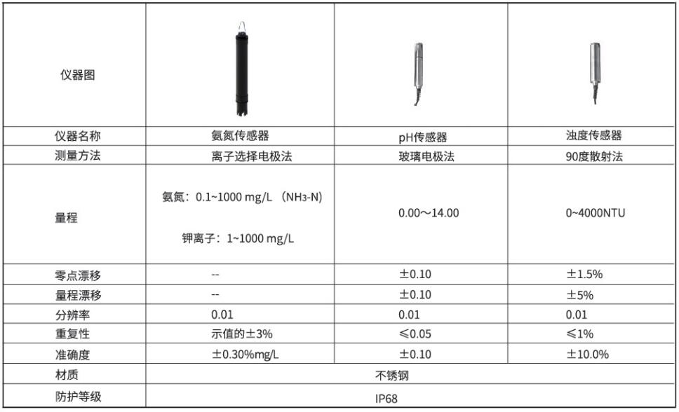 单元组成:多波长水质检测器、氨氮传感器、pH传感器、浊度传感器以及现场数据显示表头。