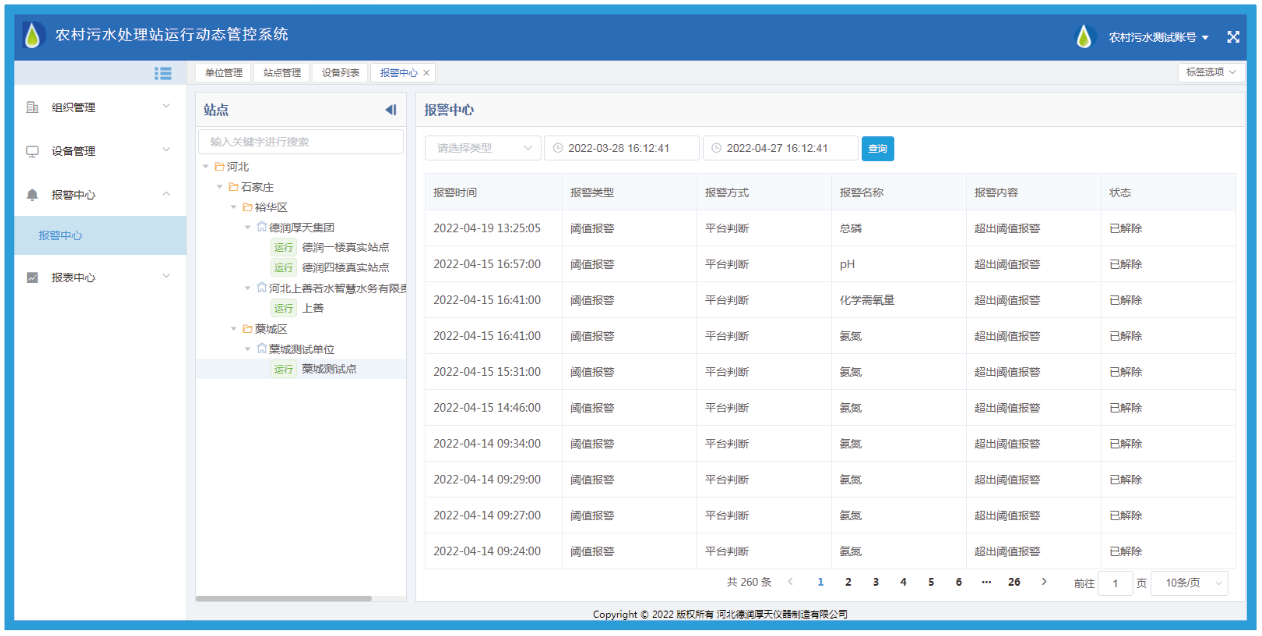 河北德润厚天科技股份有限公司一直致力于环保监测设备研发制造,公司研发团队负责人曾多次深入农村生活污水处理站实地考察,结合现场实际情况,经过大量实验及实地测试,开发出农村污水处理站运行动态管控系统。